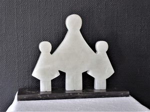 2020Geschakelde figuren uit witte albast op sokkel van Belgisch hardsteen.