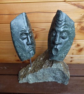 2020twee hoofden van speksteen op sokkel van ruwe serpentijn